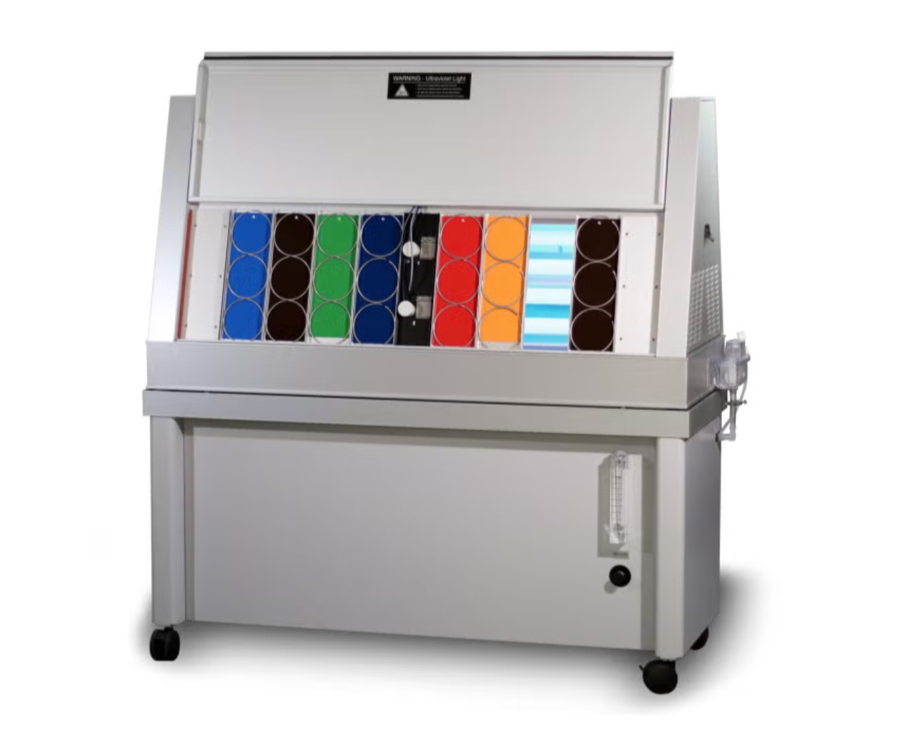 紫外光被廣泛應用于紫外線殺菌照射(UVGI),這是一種用于消除有害病毒和細菌的技術。這種波長短、能量高的紫外線還可以降解其消毒的材料及其表面。QUV/uvc型號使用UVC燈管,發射集中在254 nm波段的光來測試材料的耐用性,防止暴露在UVC光下的材料產生光降解效應。QUV/uvc具有多種安全功能,可防止UVC光泄漏。這款型號不具備冷凝或噴淋功能。