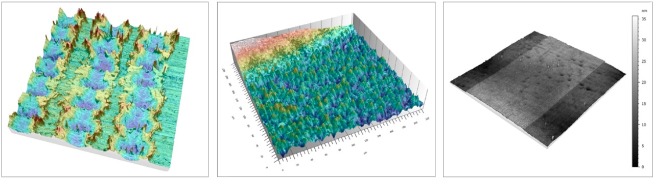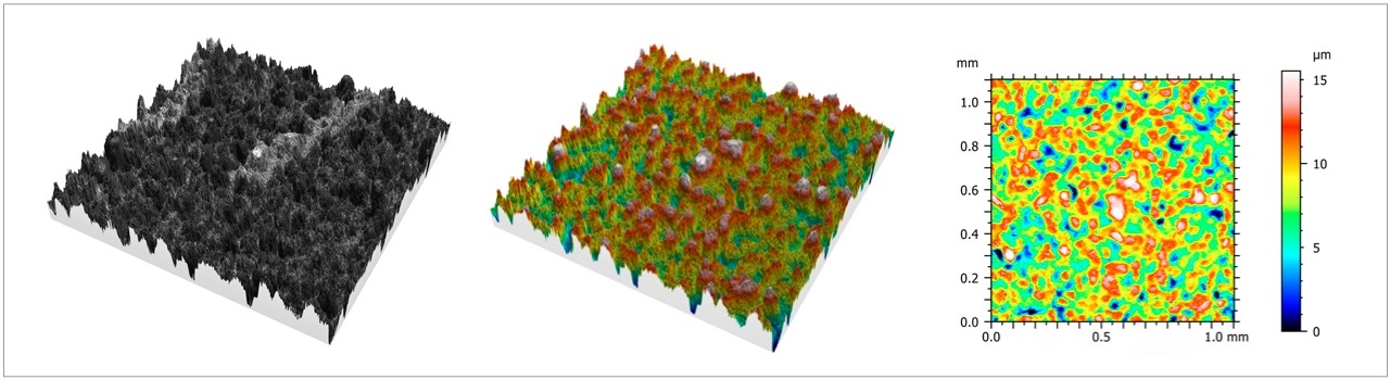 電子設備:(左圖)疊加真彩紋理的三維視圖;(中圖)用 10×/0.4 物鏡創(chuàng)建的高度圖;(右圖)用于測量區(qū)域粗糙度或紋理的二維高度圖,例如用于質量控制或確定假冒電子設備。
