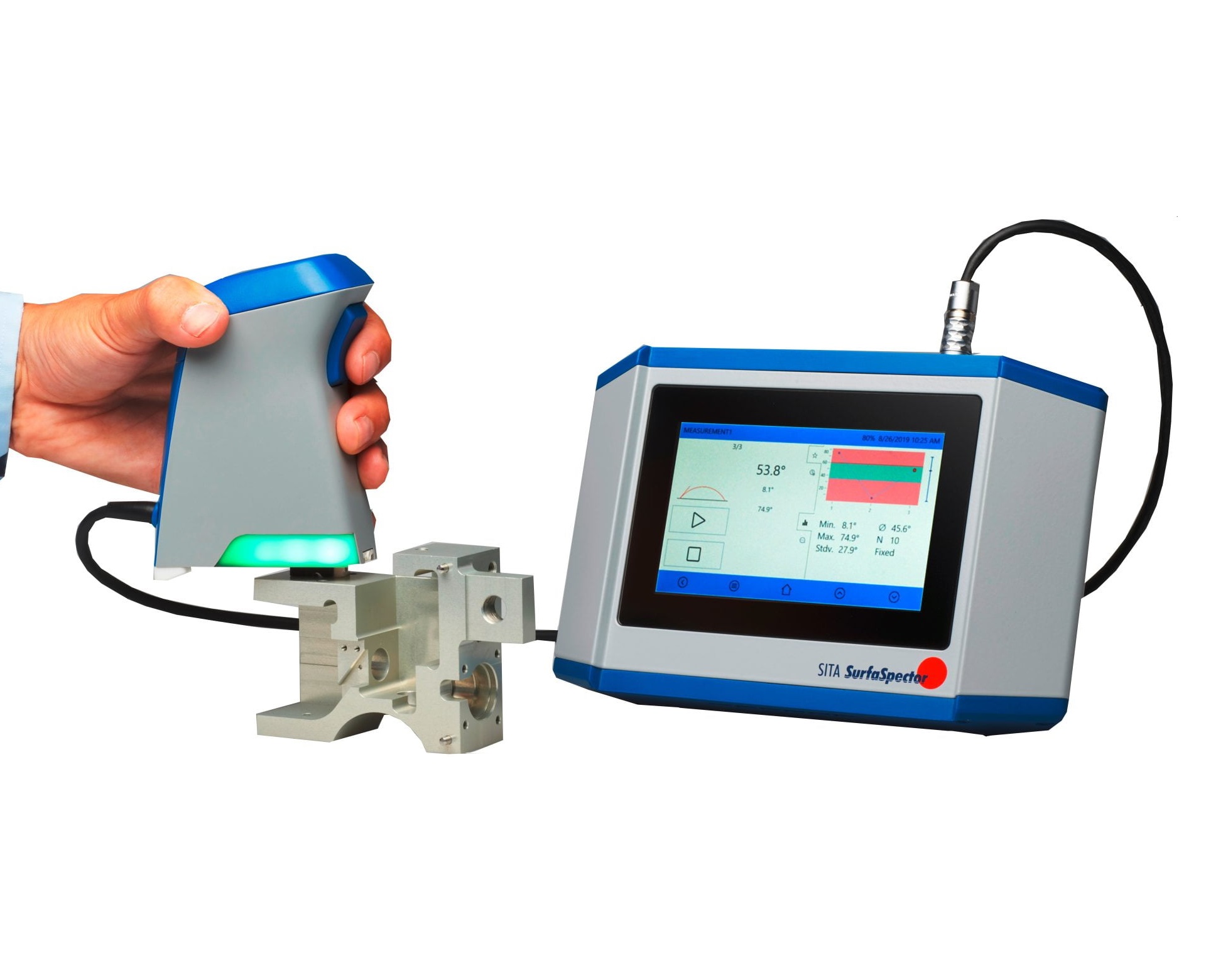自動測量程序,包括水滴定位位置,檢測水滴和直接計算接觸角; 手持式傳感器探頭,靈活測量各種形狀樣品的接觸角; 使用觸摸屏,操作簡單; 可直接移動使用,在工廠現場使用不需要連接電腦; 可選的電腦軟件SITA-SurfaceLog,實現可視化和導出測量數據功能。